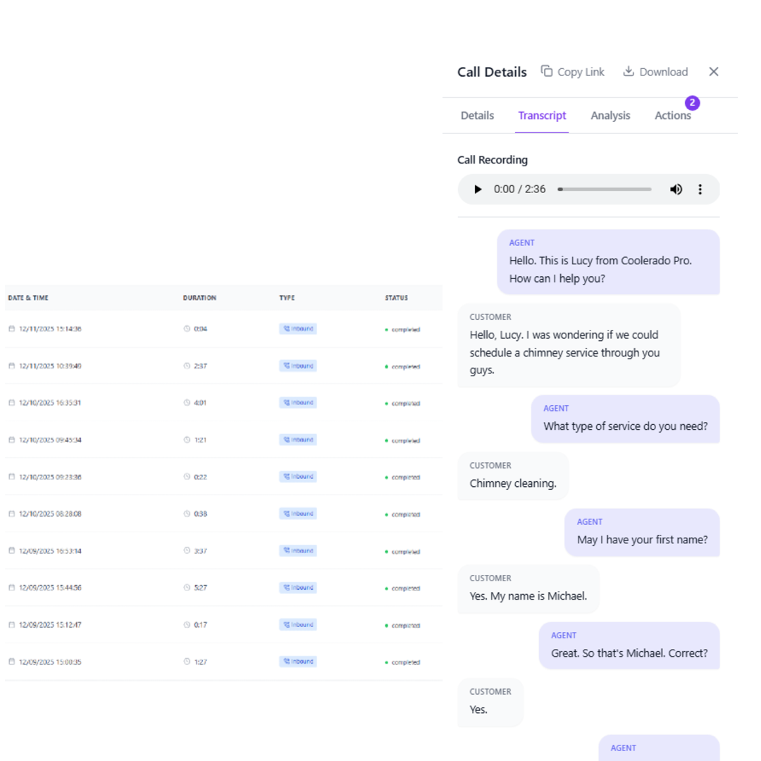 Full visibility into every call. Listen to recordings, read transcripts, track bookings, and monitor performance — all in real-time.
